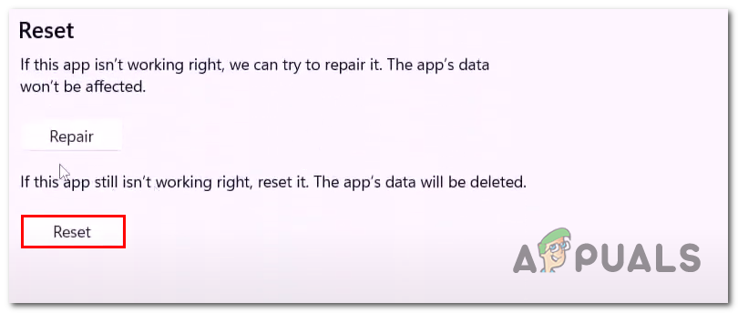 - Inside of the app settings, click on Reset and wait for a while until it finishes processing.