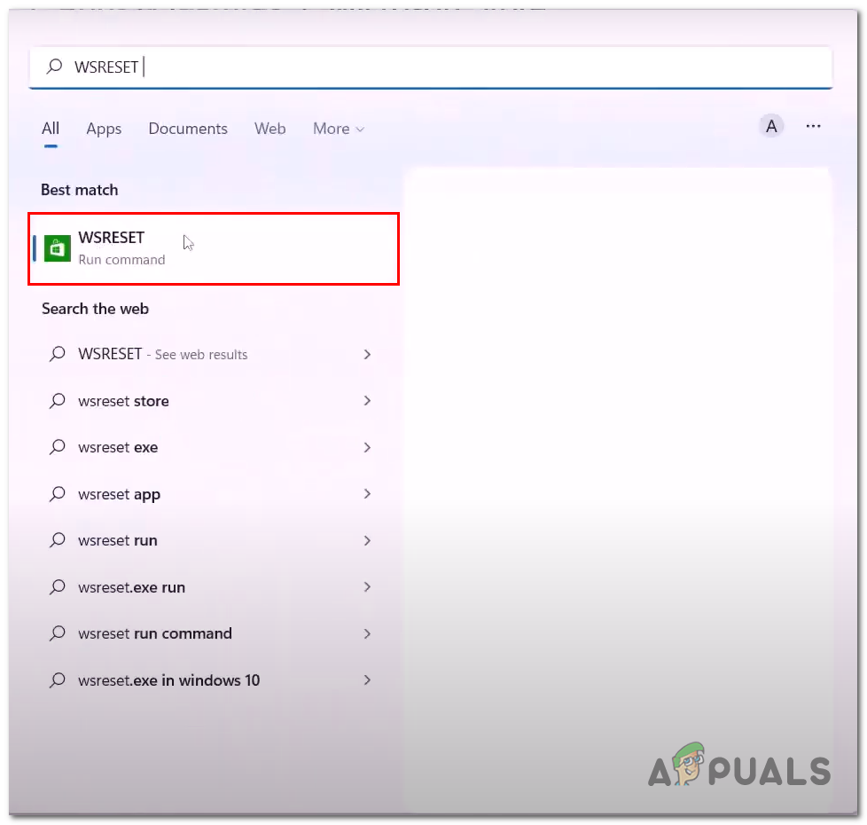 - Press the Windows key to open the start menu; inside the start menu, search bar type WsReset.