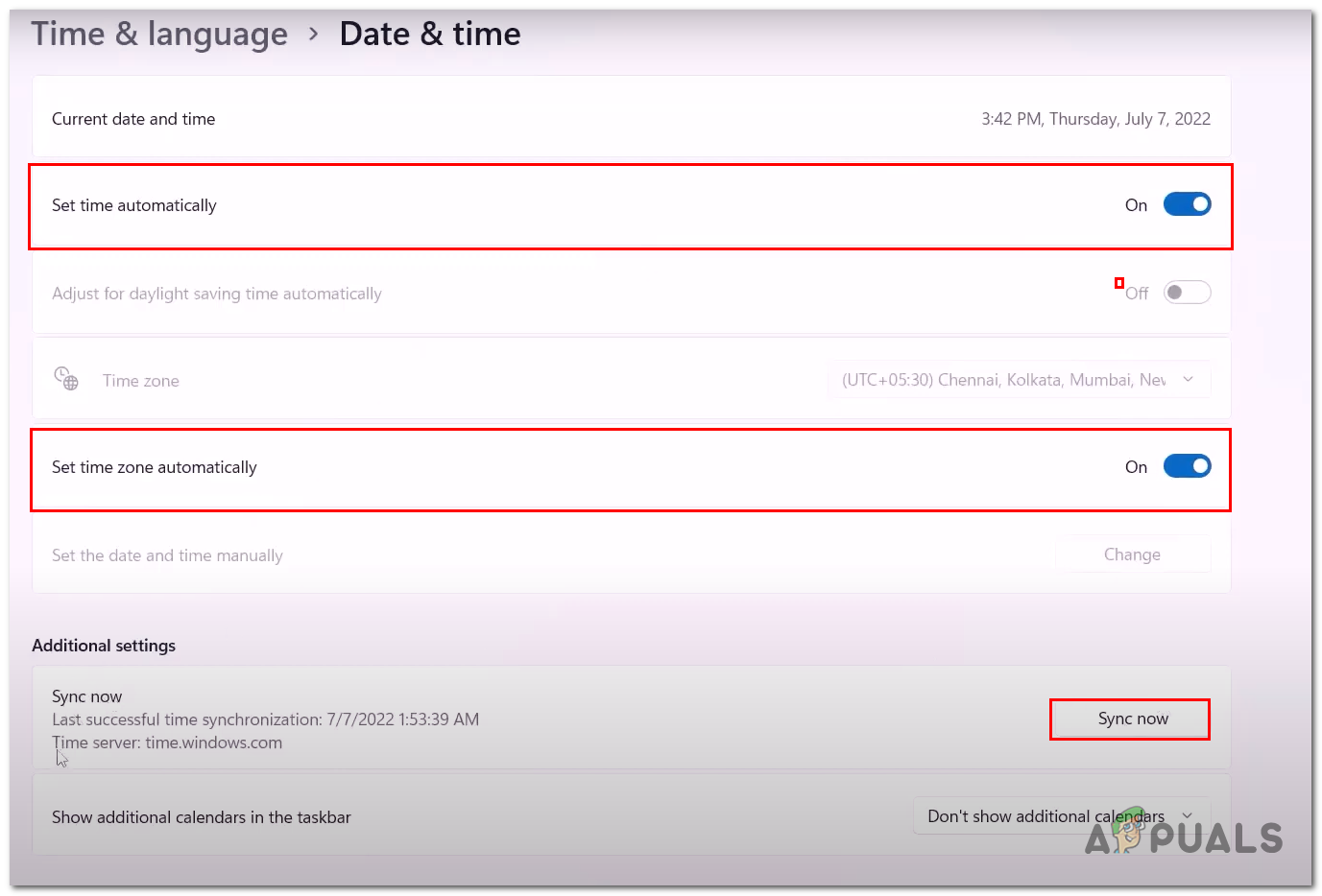 Microsoft-provided services save data with time and date attached to them. An incorrect time configured on your computer may cause a clash with the servers, thus leading to such issues. The fix is pretty straightforward; follow these steps to configure your computer’s date and time: