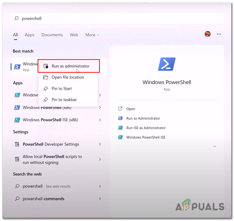 - In the start menu search bar, type Powershell and run it as an administrator.