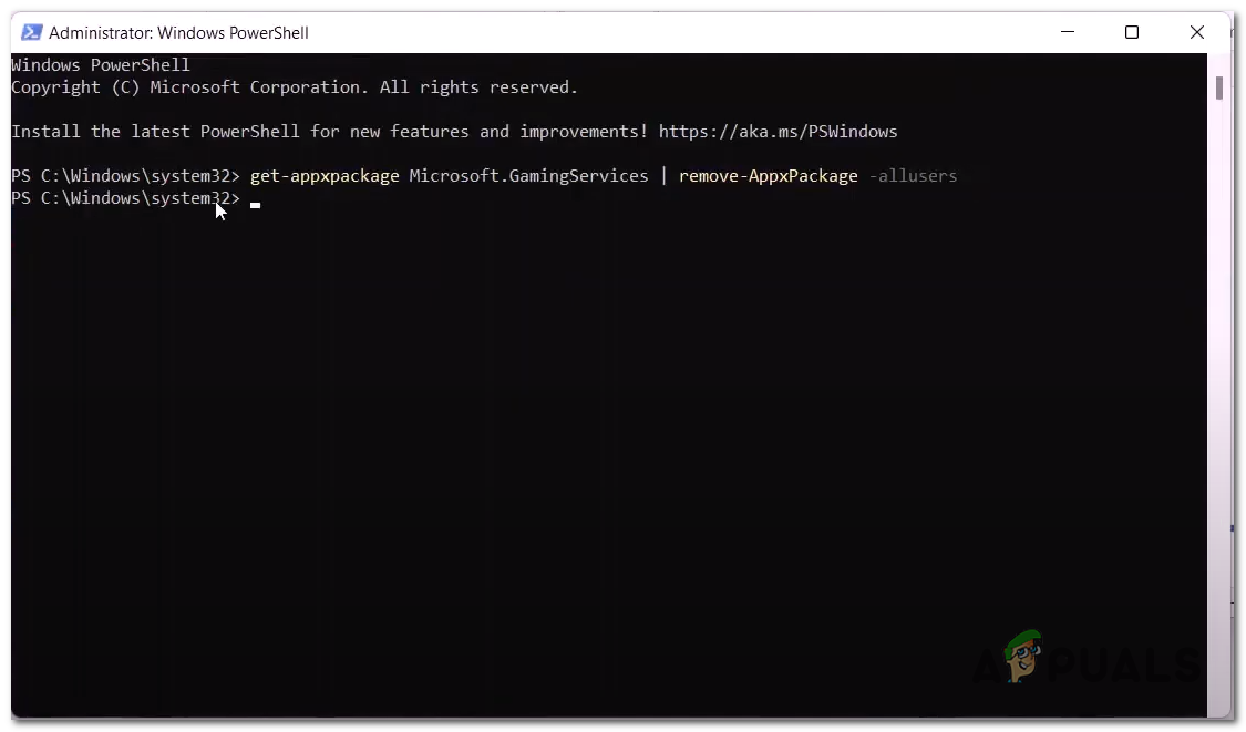 - Now, Paste the following command in the powershell terminal to uninstall the existing gaming services package.