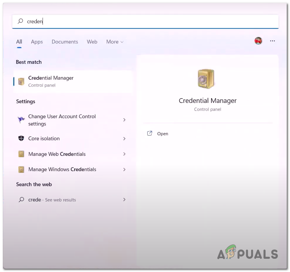 - In the start menu search bar, type Credential manager, and click on it to open it.