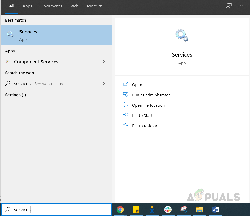 - In the Windows Search bar, type Services and press enter to open the utility.