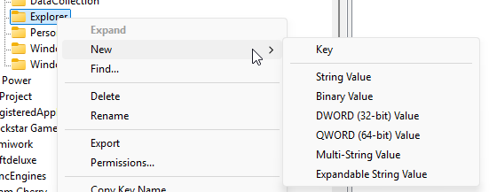 - Under Windows, look for Explorer. If missing, right-click Windows > New > Key and name it Explorer.