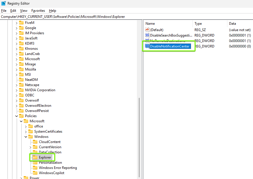Right-click the right pane > New > DWORD (32-bit) Value > name it DisableNotificationCenter.