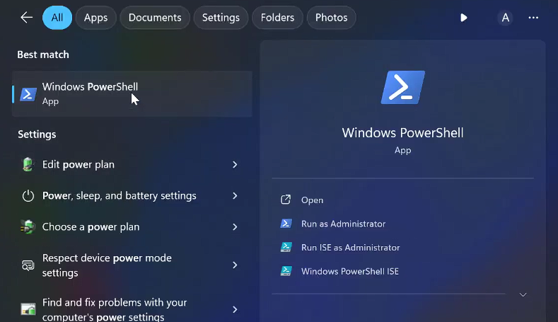 - Search for PowerShell and click Run as administrator.