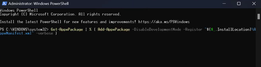 Get-AppxPackage -AllUsers | ForEach-Object { Add-AppxPackage -DisableDevelopmentMode -Register "$($_.InstallLocation)\AppXManifest.xml" }