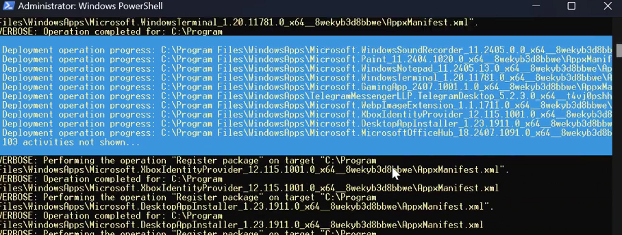Note: This command re-registers built-in apps for all users. It can take a while and may show some red errors, which can be normal for apps not installed for everyone.