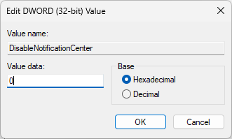 - Double-click DisableNotificationCenter and set Value data to 0.