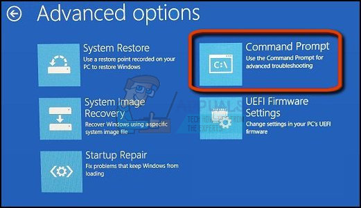 - Instead of restarting, a blue screen will appear with several options. Choose Troubleshoot >> Advanced Options >> Command Prompt.