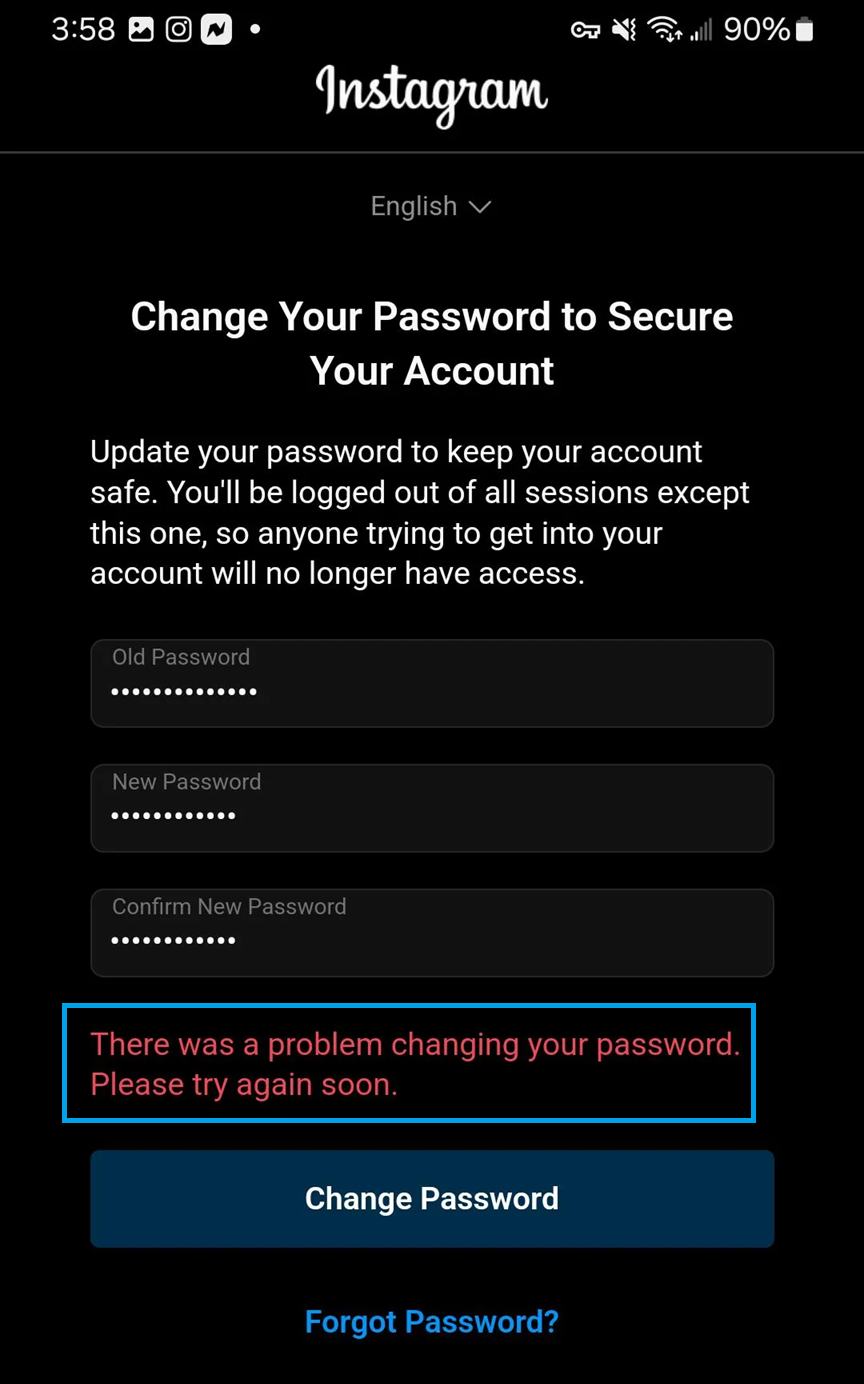 This secondary error typically appears when Instagram still considers the account at risk, or when the current login session is invalid or corrupted. Retrying the reset repeatedly can extend the temporary restriction.