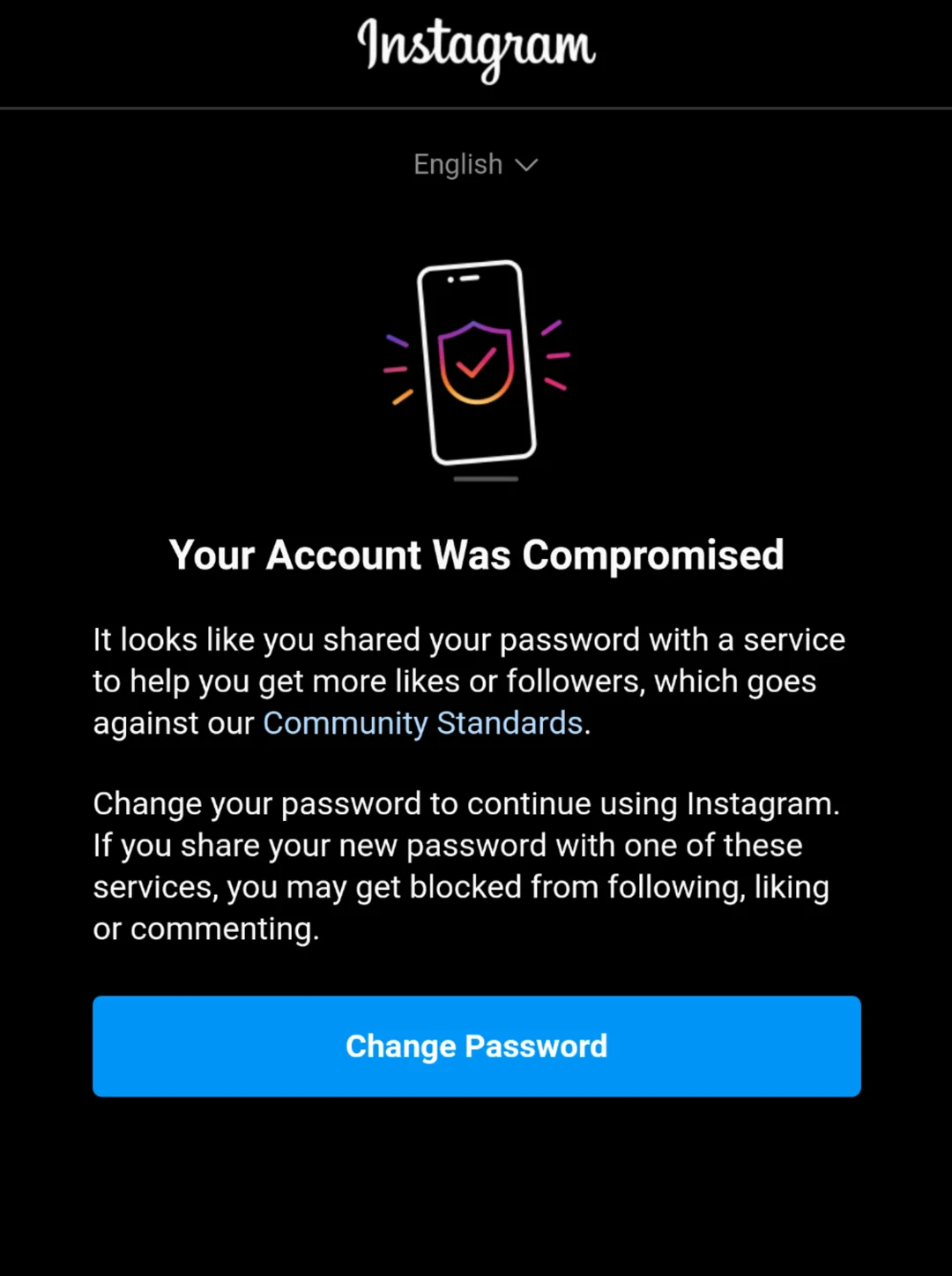 As a protective measure, Instagram may temporarily restrict access and require you to change your password before allowing further use of the account. In some cases, Instagram also blocks password changes temporarily while additional security checks are performed.