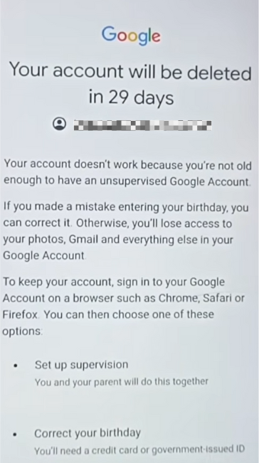 If the birth date associated with your Google account shows you are younger than 13, Google will schedule your account for deletion. You will be given 14 days to take action and recover your account. If no action is taken, the account will be disabled, and all data will be permanently deleted on the 30th day.