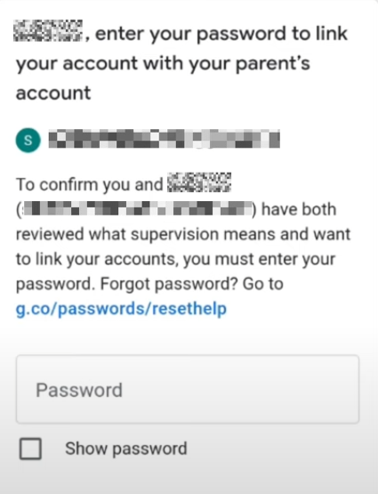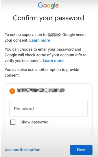 - Enter the password for your parent’s account and click Next.