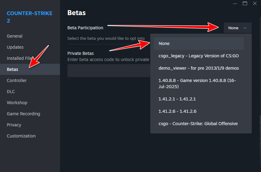 - Being on a Steam/CS2 beta branch that does not match live servers