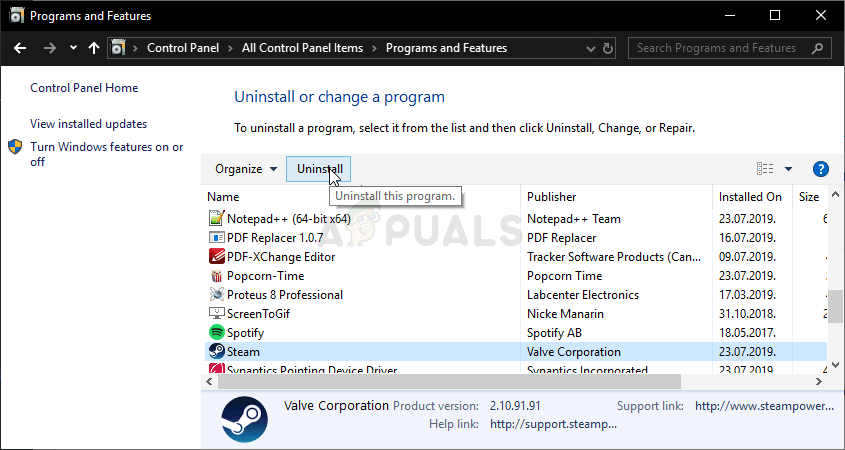 Uninstalling Steam in Control Panel - Now follow the prompts on your screen to complete the Steam uninstallation process.