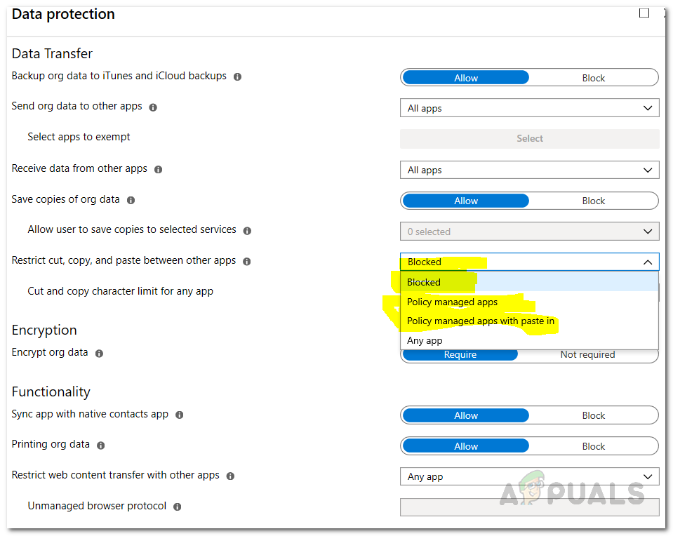 As we have mentioned above, the error message in question is generated by your Microsoft Intune policies. Specifically, the Data Protection policy found under App Protection is responsible for this behavior. If the Restrict cut, copy and paste between other apps feature is set to blocked, you won’t be able to copy data between apps. This is why the said error message is displayed. However, this doesn’t affect protected apps so you can copy data between protected apps freely.