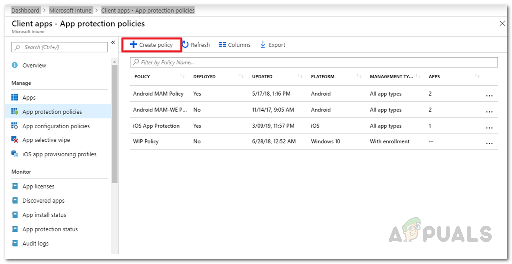 Microsoft Intunes Client Apps - From the list of policies, click on the respective policy that is installed on your device to edit it. Or, you can create a new policy for this via the Create policy button.