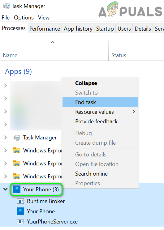 The issue at hand could be a result of a temporary glitch of the application due to its processes are in the error state. In this case, ending Your Phone Application’s processes and relaunching the application may solve the problem.