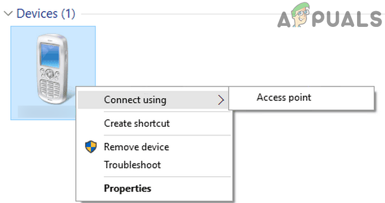 Join a Personal Area Network - Now select your mobile phone and open the Connect Using dropdown to select Access Point.