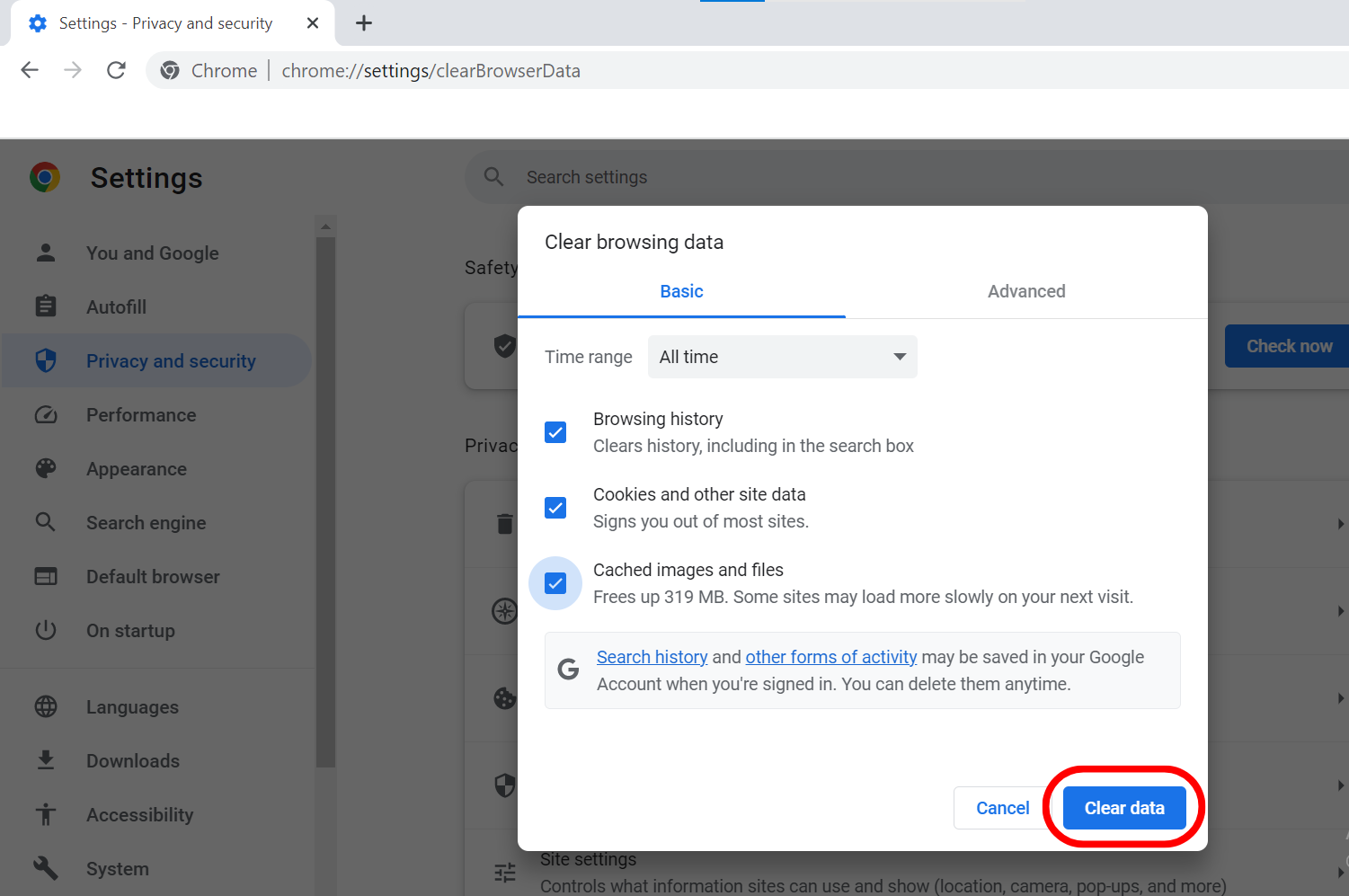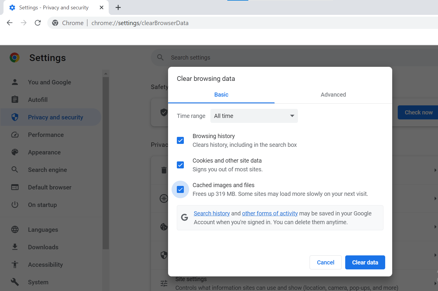 Step 2: Choose All Time for the Time range and check that the Browsing History, Cookies and other site data, and Cache images and files are checked.
