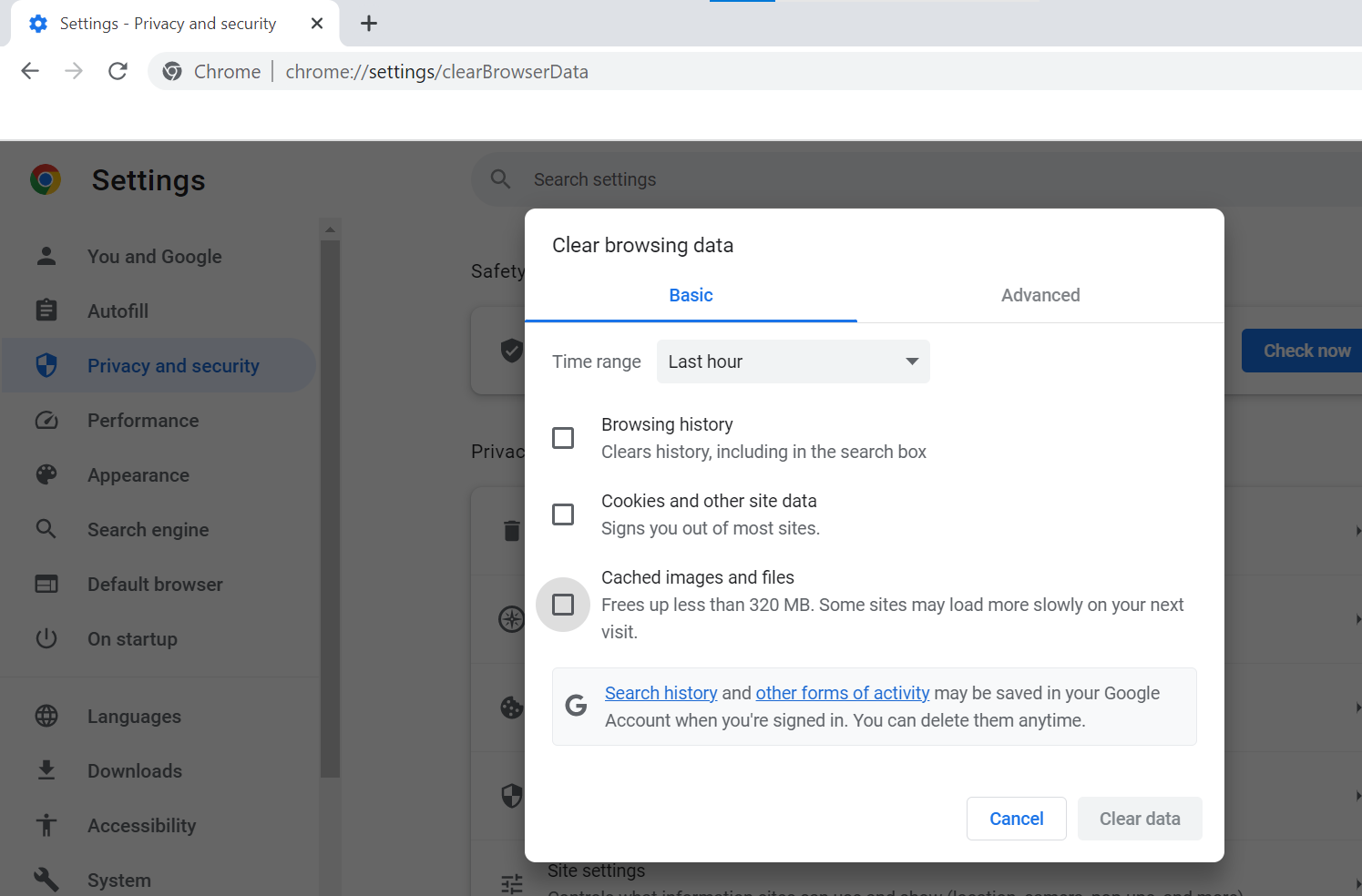 Step 1: In the address box of your browser, type chrome://settings/clearBrowserData, and press Enter. The following dialogue box will appear.