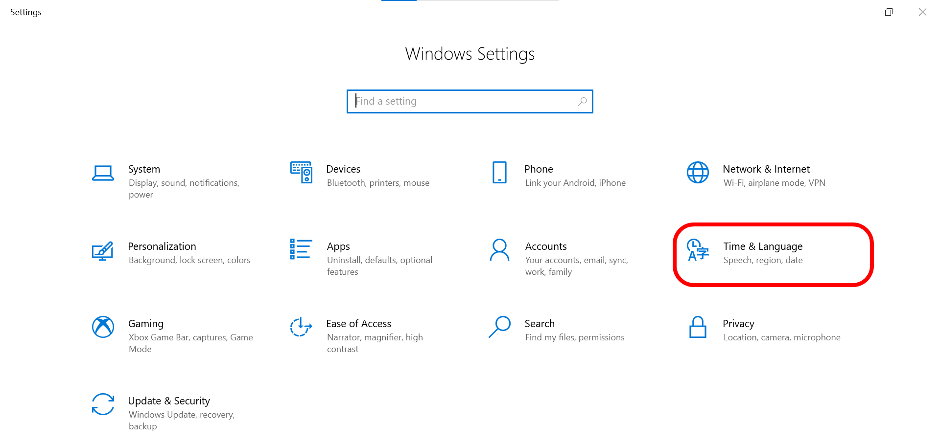 The second step is to look for the “time and language” option. In certain systems, it may appear as “time and date“.