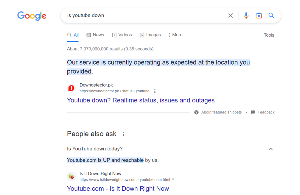 To check whether YouTube is down, visit its status page on DownDetector or type “Is YouTube down” into Google to see the most recent news regarding the site. If the page cannot be accessed at the moment, you can try again later. Your internet connection might be fine but YouTube itself might have a glitch in their system.