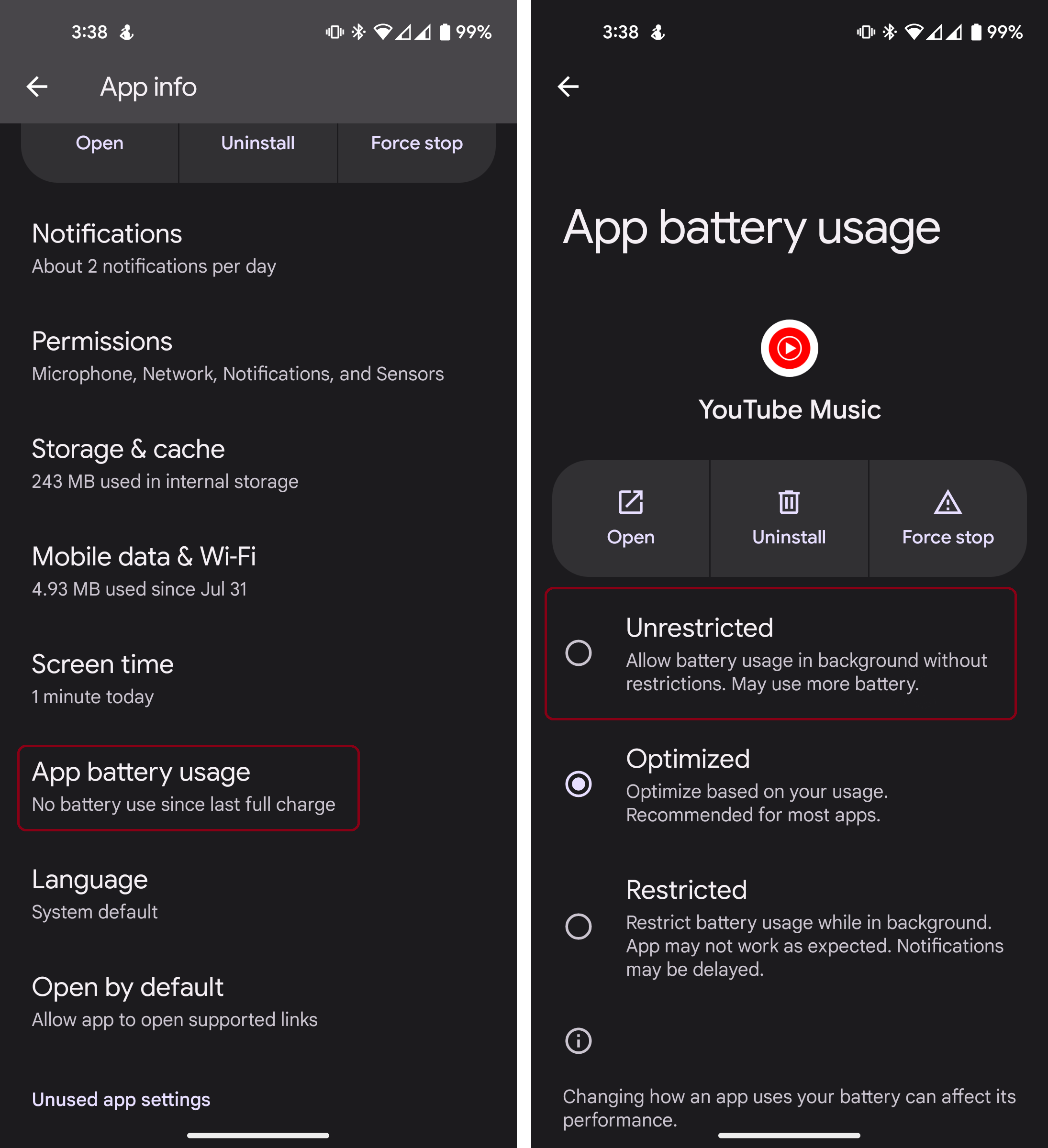 To set it to unrestricted, simply go to Apps > YouTube Music > App battery usage, and change the battery optimization option from “Restricted” or “Optimized” to “Unrestricted.” Of course, this setting only works on Android so if you have an iPhone, try the next method.
