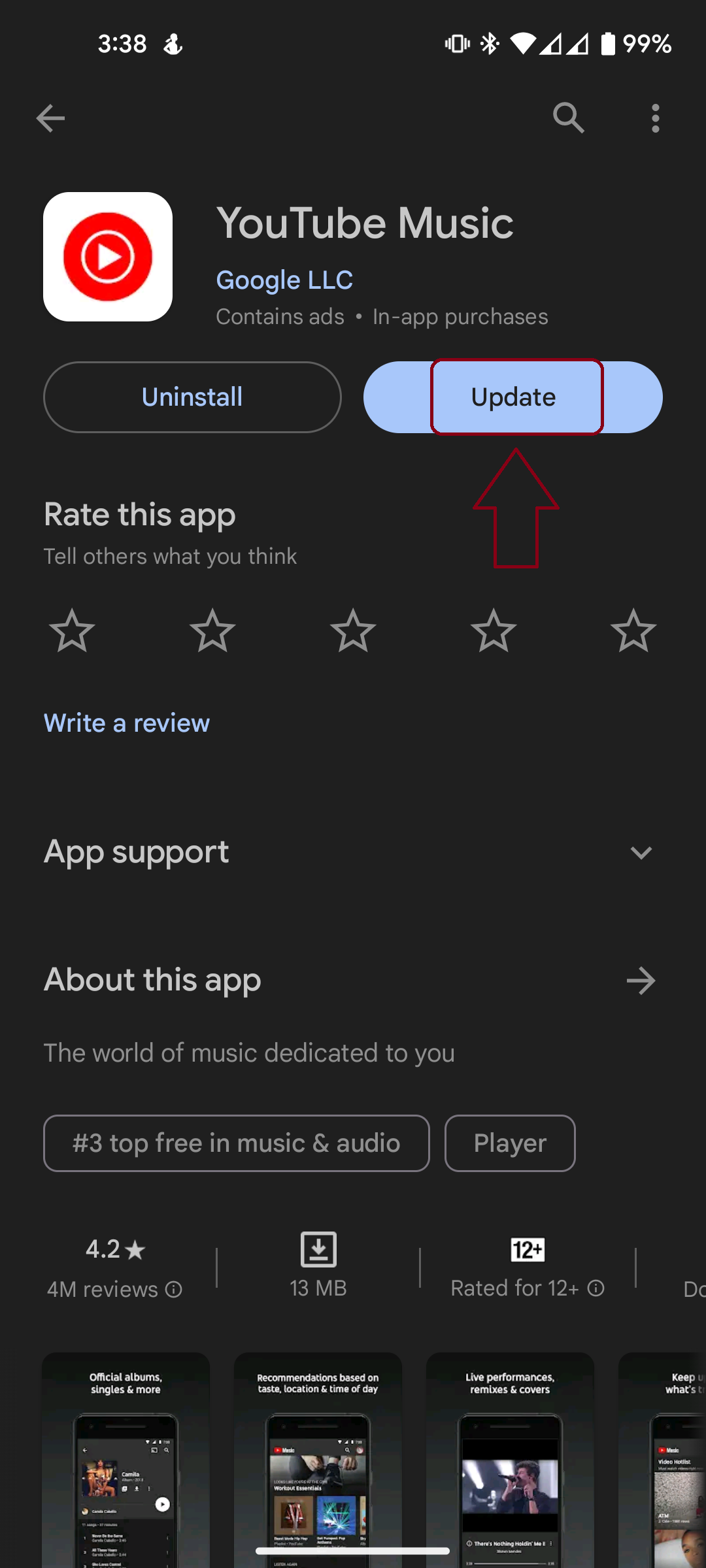 Sometimes, when there is an issue from the backend, developers release an update for the app to fix known bugs and issues in it. Make sure that your app is updated to the latest version. You can do this by going to the Play Store or App Store and searching for the YouTube app then hitting the big “Update” button.