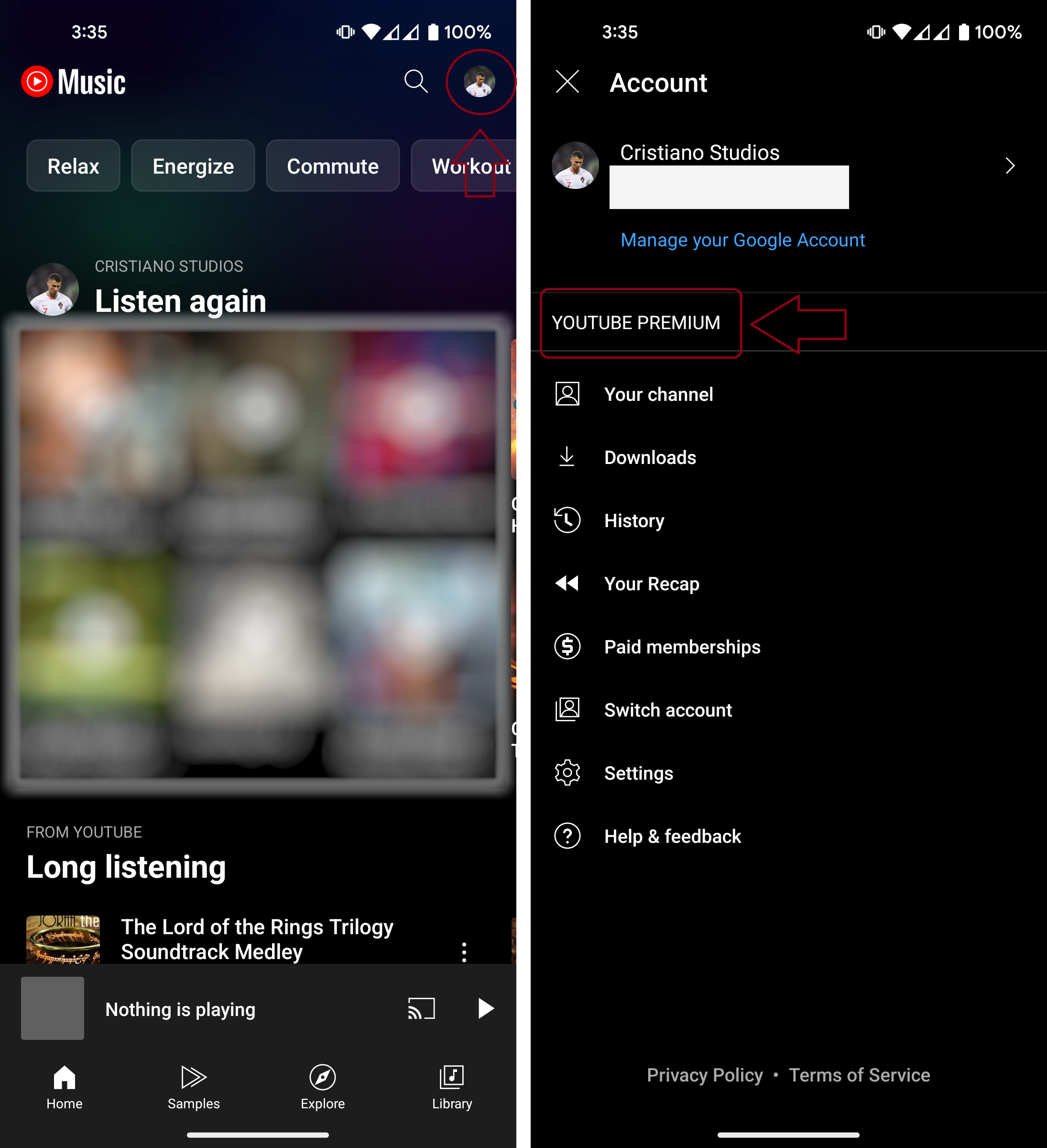 To check if your account has Premium, simply tap on your account’s profile picture on the top right-hand side corner and see if “YouTube Premium” is written beneath your account.