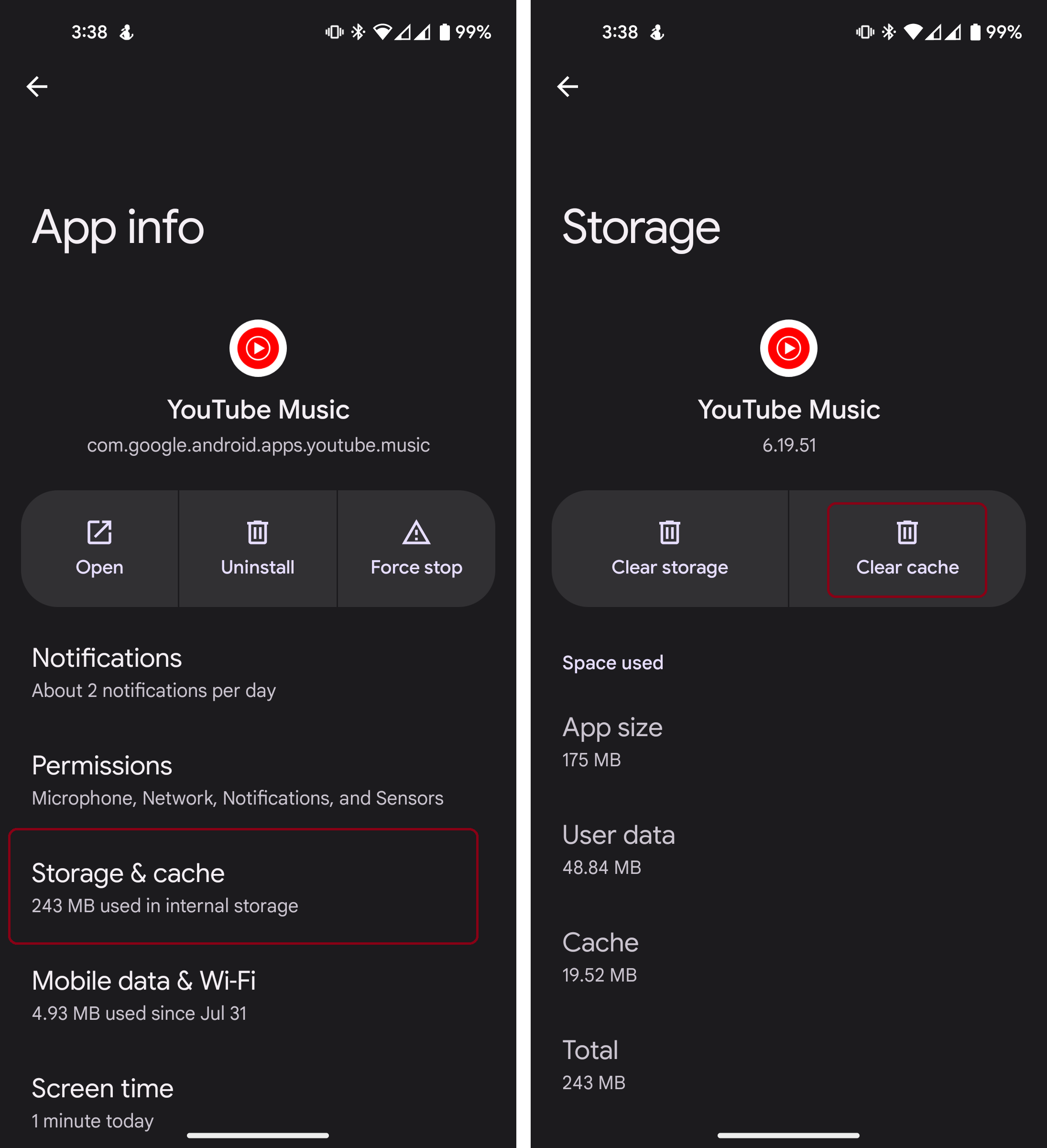When nothing seems to work, clearing the app cache often does the trick. While this won’t remove any data from YouTube Music itself, it will allow you to check if the problem has actually been resolved without any external issues.