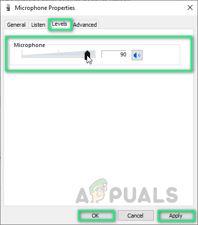 Enabling Listening to Microphone Device Option - Switch to the Levels tab. Now keep speaking something in the microphone device and adjust the intensity level by dragging the bar left and right or by putting in the numeric value between 10 and 100 until you hear your voice in a decent manner. Once done, click Apply > OK.