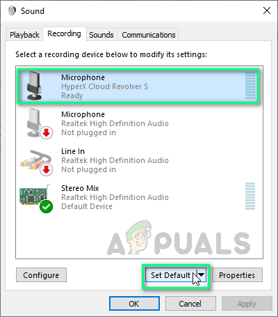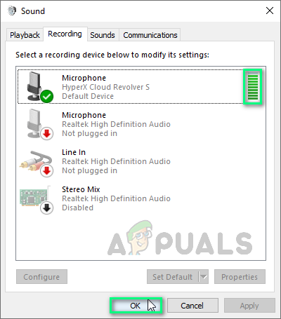 Setting Microphone Device as Default - Now perform a final check by speaking something in your microphone device. If bars are moving as shown in the image below then you are good to go. Click OK to close Sound Control Panel.