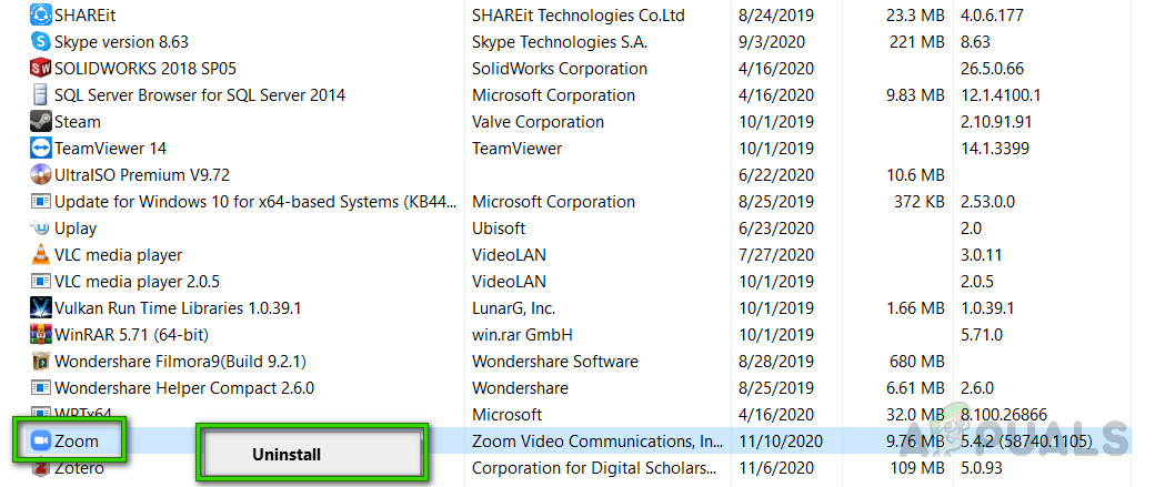 Opening Installed Programs List - Locate Zoom application, right-click on it and select Uninstall. This will start uninstalling the Zoom application from your PC. The procedure may take some time so wait until it gets finished.