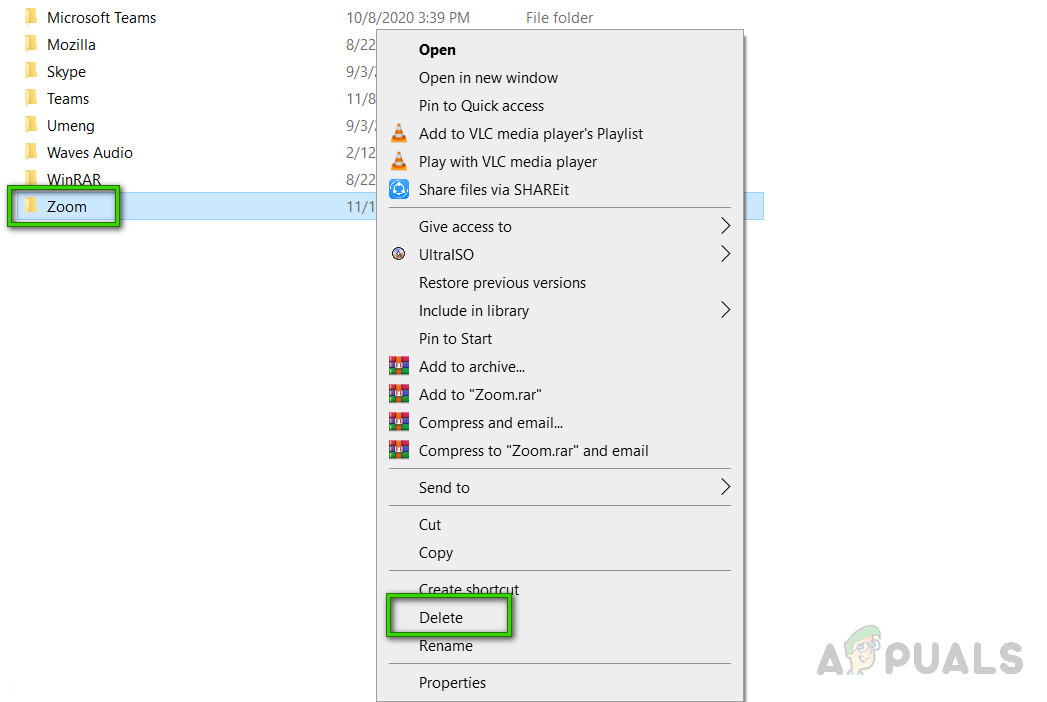 Opening AppData Folder - Right-click on the Zoom folder and select Delete.