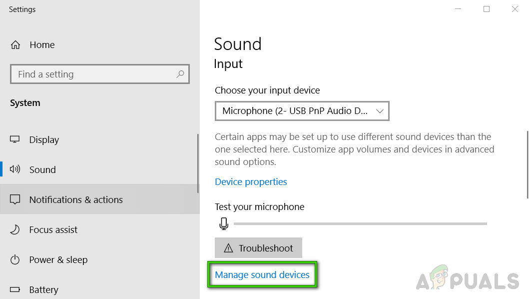 Opening Windows Sound Settings - In the Input section, click the Manage Sound Devices option under Troubleshoot.