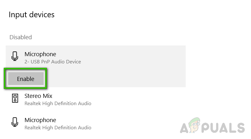 Opening Sound Devices Manager - Check if your microphone (mostly your microphone’s model name appears) is located under the Disabled section. If it’s there then your microphone is disabled which is ultimately causing this problem. Click on your Microphone Device option and then click Enable. This will allow Windows to use your microphone as a recording device for itself and different applications i.e. Zoom, Skype, etc.