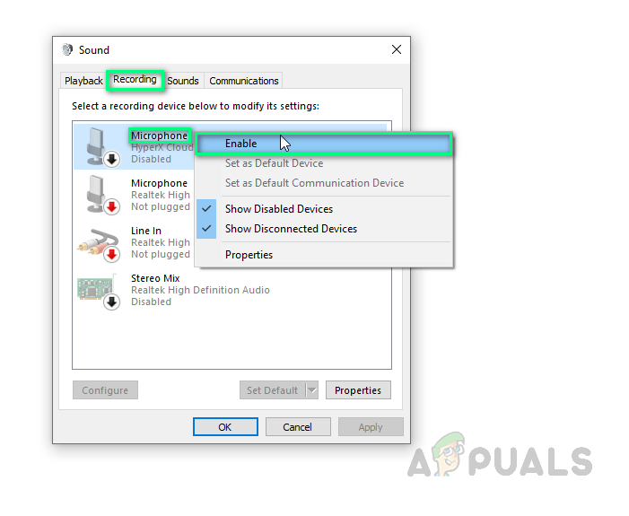 Opening Sound Control Panel - Switch to the Recording tab and check if your microphone (mostly your microphone’s model name appears) has Disabled written under its option and greyed out. If it is the case as shown in the image below, right-click on your Microphone Device option and then click Enable. This will allow Windows to use your microphone as a recording device for itself and different applications i.e. Zoom, Skype, etc.