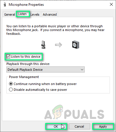 Opening Microphone Device Properties - Switch to the Listen tab and check the box for Listen to this device option. Click Apply > OK. You will now be able to hear whatever you speak in your microphone. Move to the next step to understand the cause behind this action.