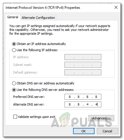 - Enter 8.8.8.8 and 8.8.4.4 in the Preferred and Alternate DNS server fields respectively.