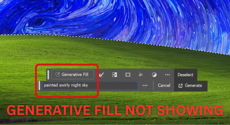 The “Generative Fill Not Showing” issue in Photoshop occurs when the Generative Fill option does not appear (or remains greyed out) in the Contextual Task Bar after making a selection. This prevents you from generating AI-powered edits in your project. In some cases, the issue can occur even on a recent version of Adobe Photoshop.